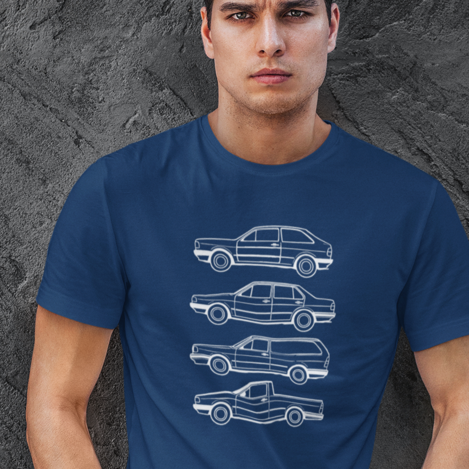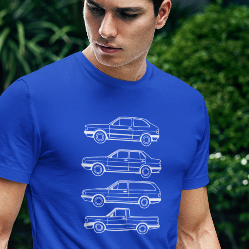 Camiseta com estampa da familia VW Quadrados, Gol, Voyage, Parati e Saveiro.
