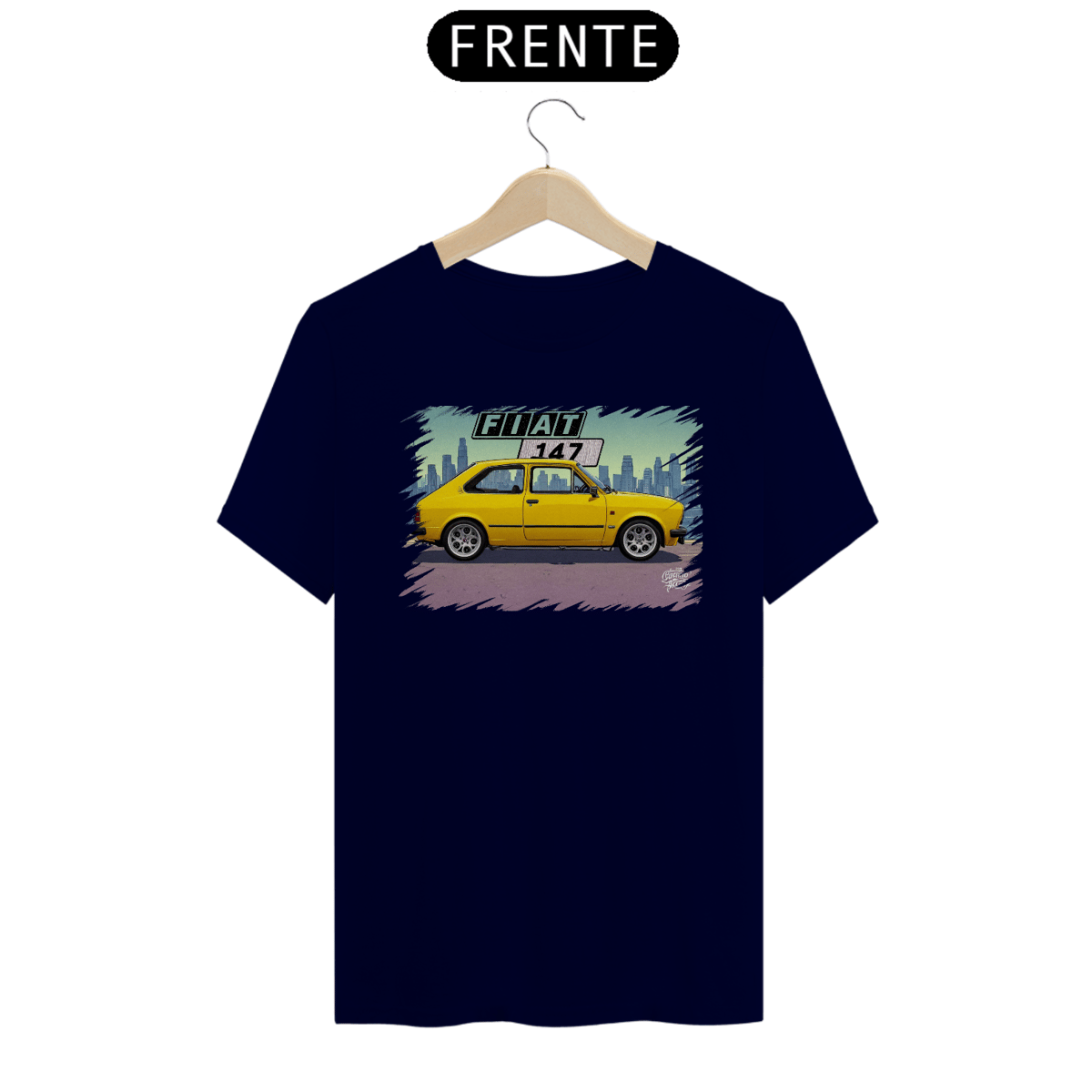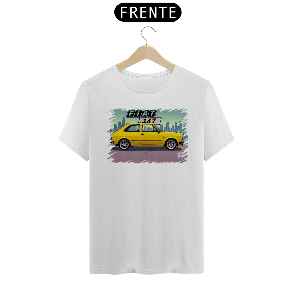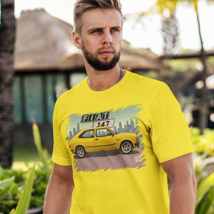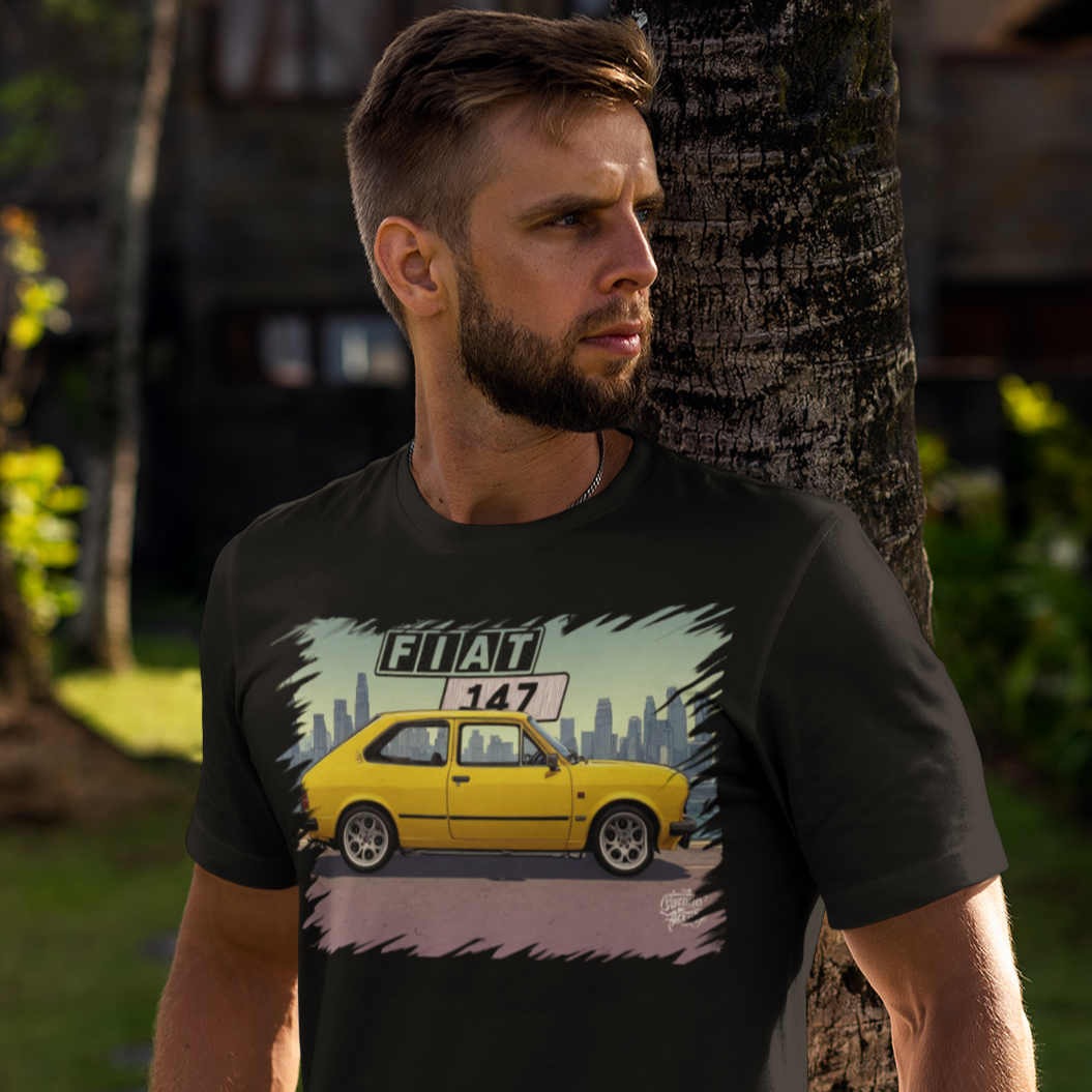 Camiseta com estampa do Fiat 147 Visto de lateral com seu emblema.