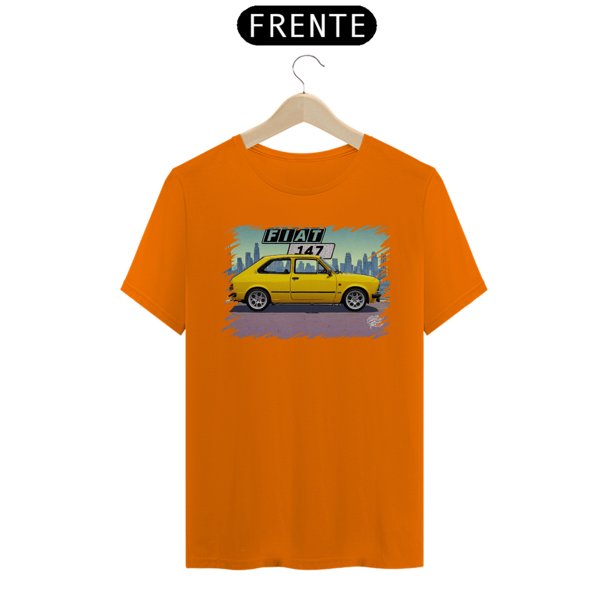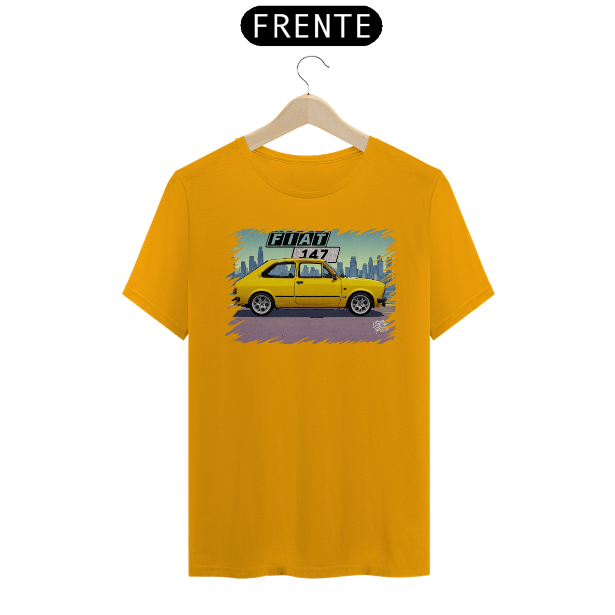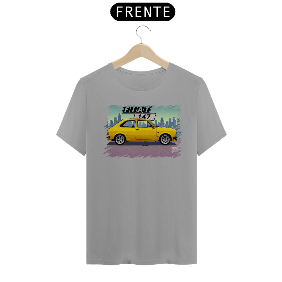 Camiseta com estampa do Fiat 147 Visto de lateral com seu emblema.