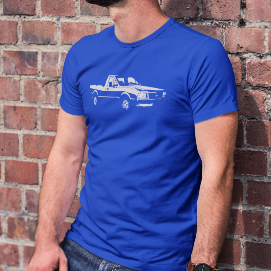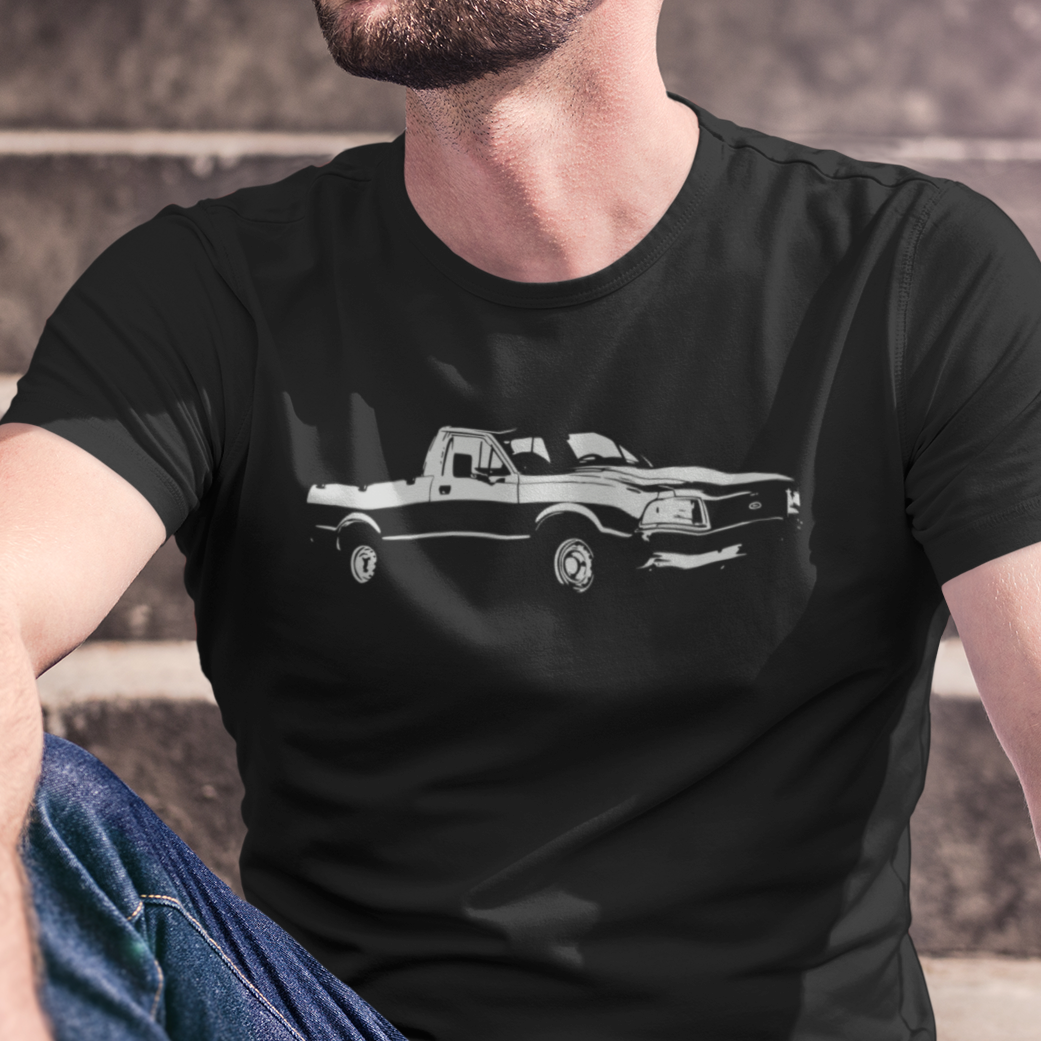 Camiseta com a estampa da silhueta de uma Ford Pampa.